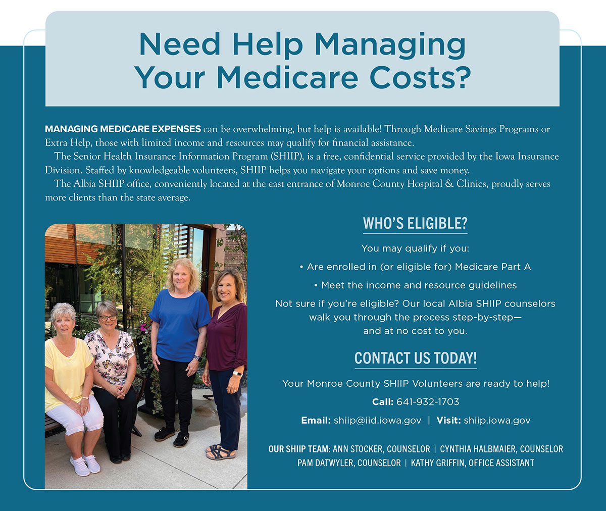 For more information or help determining your eligibility, contact your local Albia SHIIP office by calling 641-932-1703. You may also dial 1-800-351-4664 for customer support, email shiip@iid.iowa.gov, or visit https://shiip.iowa.gov/.